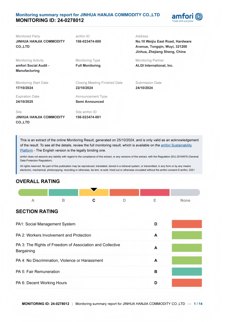 Temmuz 2025'te,Jinhua Hanjia Emtia Co., Ltd.Kooperatif Birliği Enseigne tarafından atanan Üçüncü Taraf Avrupa Denetim Ajansı tarafından yürütülen Uluslararası Standartlar Sınıflandırması (ICS) Fabrika Denetim Programı'nda C seviyesi sertifikası elde etti. Bu sertifikasyon sistemi dört katmandan oluşmaktadır: A, B, C ve D. Fransız Ticaret ve Sanayi Odası'nın (FCD) bir üyesi olarak şirket, Uluslararası Çalışma Örgütü'nün Sosyal Yönetim Şeması Standart SA8000'e bağlıdır ve tedarikçileri üzerinde sosyal sorumluluk denetimleri uygular.