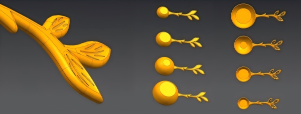İlk olarak, önceki deneyimlere dayanarak ürünün şeklinin ve potansiyel kullanımının değerlendirilmesini içeriyordu. Ana malzeme olarak çinko alaşımı kullanarak, malzeme yoğunluğunu ve yüzey özelliklerini hesapladık, ergonomiyi dahil ettik ve dört ölçüm kaşığı veya buz kaşığının genel boyutlarını tasarladık. Daha sonra, her bir eğriyi, R yarıçapı açısını ve diğer küçük ölçekli ayrıntıları bu boyutlara göre geliştirdik.