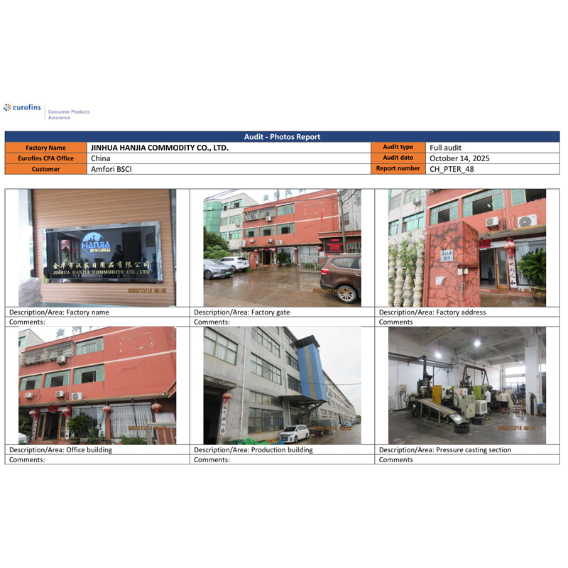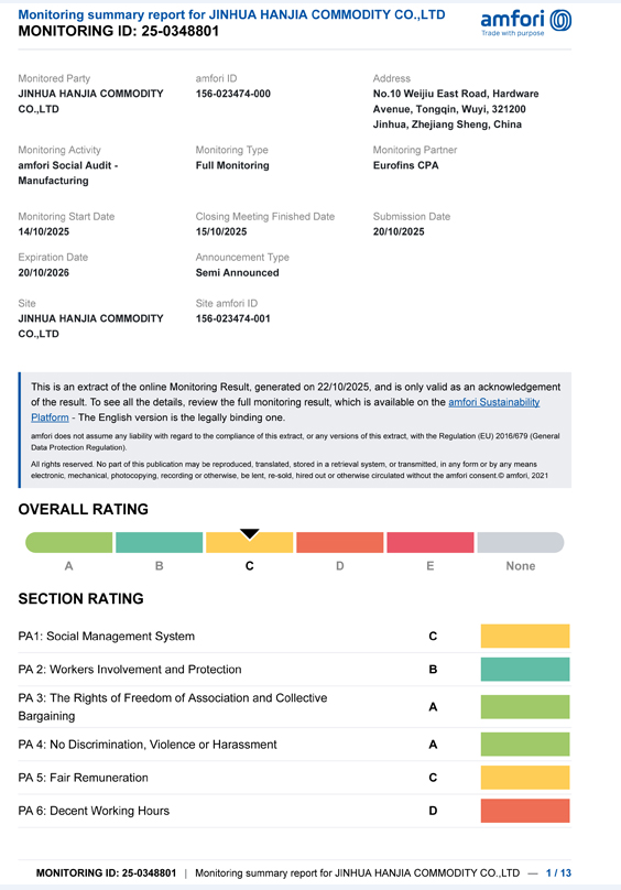 Jinhua Hanjia emtia Co., Ltd., BSCI denetiminin sonuçlarını açıkladı. 14 Ekim'de şirket, profesyonel değerlendirmeyi başarıyla geçti ve müşteri tarafından belirtilen minimum gereksinimleri karşılayan C Sınıfı sertifikasını aldı. Bu sertifikanın geçerlilik süresi bir yıldır. BSCI denetimi, müşteri tarafından seçilen EUROFINS ajansı tarafından gerçekleştirildi. Bu müşteri, şirketimizden uzun süredir şarap açacakları, şarap aksesuarları ve kokteyl çalkalayıcı gibi paslanmaz çelik ürünler satın alıyor. Müşterinin ülkesi, tedarikçilerin bu sertifikaya sahip olması gerekmektedir.